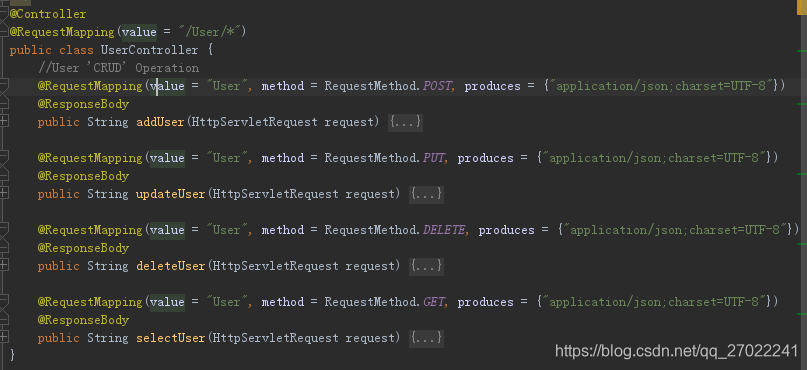 如果当前url是 http://localhost:8080/User,那么用户只要请求这样同一个URL就可以实现不同的增删改查操作,例如: