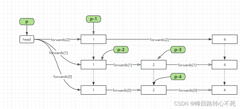 极客时间王争老师跳表SkipList学习 刚开始看王争老师的代码有点不知所措,再看完JDK中的跳表实现后恍然大悟,还是自己太笨,没有找到关键问题之所在。王争老师的代码和JDK中的代码中所使用的数据结构不相同,但是大致思路是一致的。jdk中维护索引节点之间的关系使用指针right, down ,而王政老师使用的是数组,个人认为指针比数组更好理解更清晰。王争老师的代码只用了一种对象Node 就实现了跳表,非常巧妙。