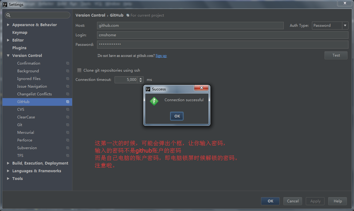 这个才是github链接测试,这个图里面输入的是github网站你申请的账号密码。(具体描述,可参见文章底部更新的图。)