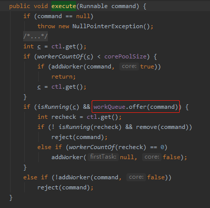 所以,就是看 wc > corePoolSize 条件,wc 是活跃线程数。此时活跃线程数为 3 ,大于核心线程数 2。