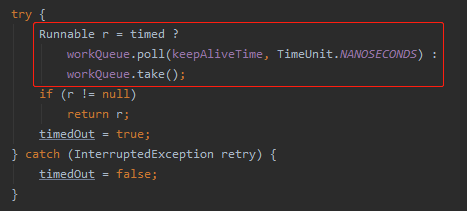 当 timed 参数为 true 的时候,会执行 workQueue.poll(keepAliveTime,TimeUnit.NANOSECONDS) 方法。