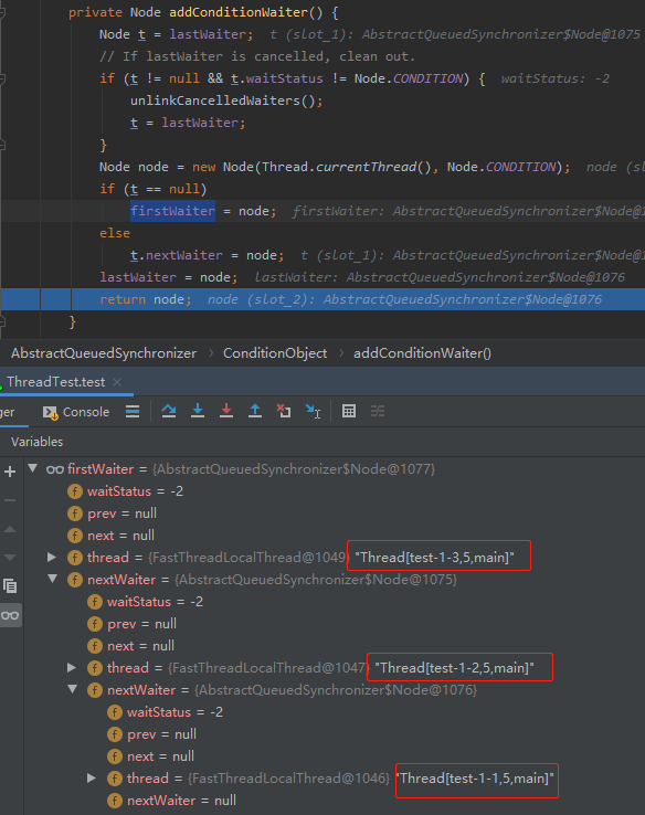 可以看到 addConditionWaiter 方法其实就是在操作我们要找的那个队列。学名叫做等待队列。