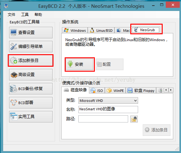 4. 运行EasyBCD,“添加新条目”->“NeoGrub”->“安装”。如下图: