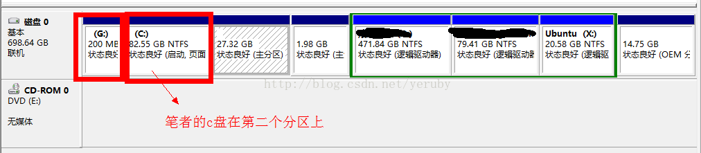 查看方法:右键我的电脑,点击“管理”,点击“磁盘管理”,即可查看到。下图即可看出,笔者的c盘在第二个分区中。