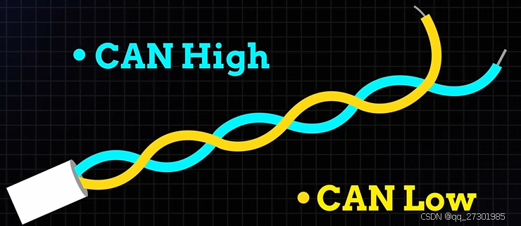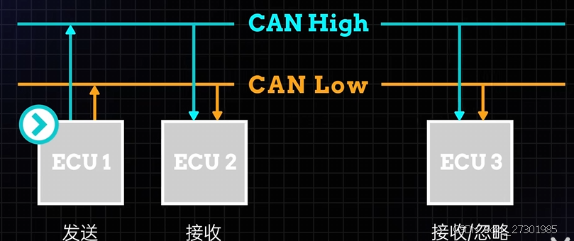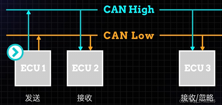 由CAN低线和CAN高线组成,广播的数据被CAN网络上的所有其他ECU接受,每个ECU都接受数据,并且检查数据,并且决定是否接受或者忽略他
