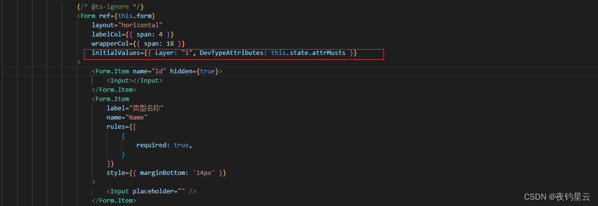 在 initialValues属性中设置表单Name的名称和默认的值,页面渲染成功,解决问题