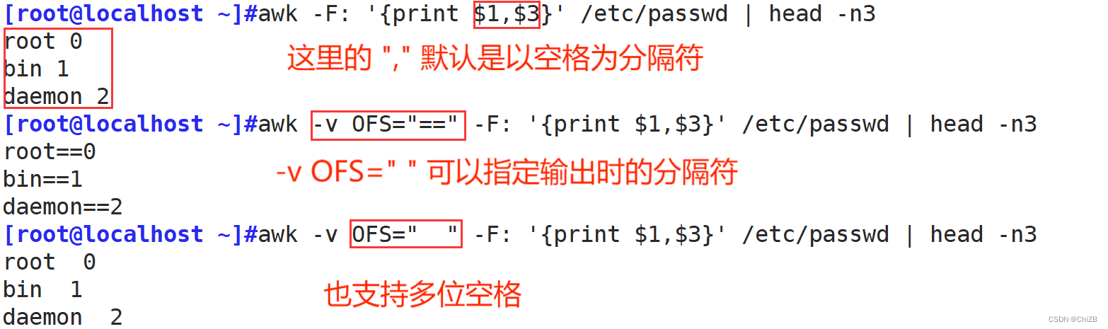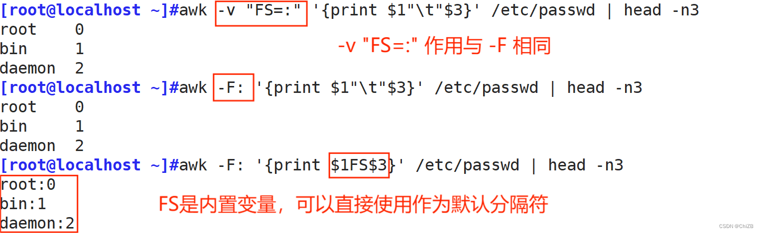 | FS | 指定每行文本的字段分隔符,缺省为空格或制表符(tab)。与 “-F”作用相同 -v "FS=:" |