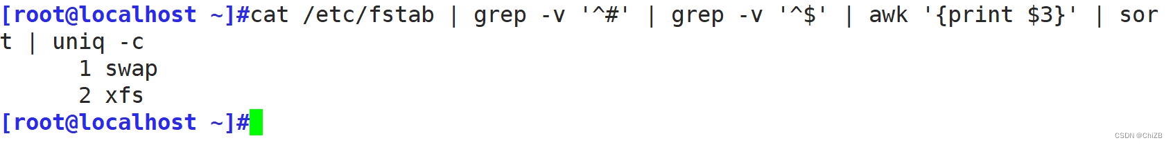 8. 统计/etc/fstab文件中每个文件系统类型出现的次数