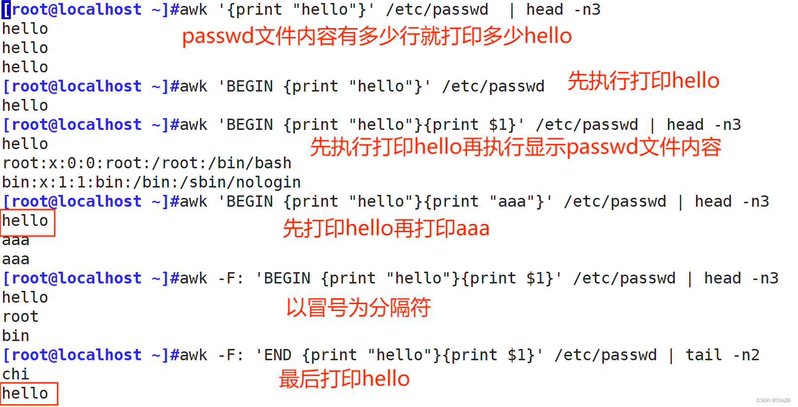 BEGIN语句块在awk开始从输入流中读取行之前被执行,这是一个可选的语句块,比如变量初始化、打印输出表格的表头等语句通常可以写在BEGIN语句块中