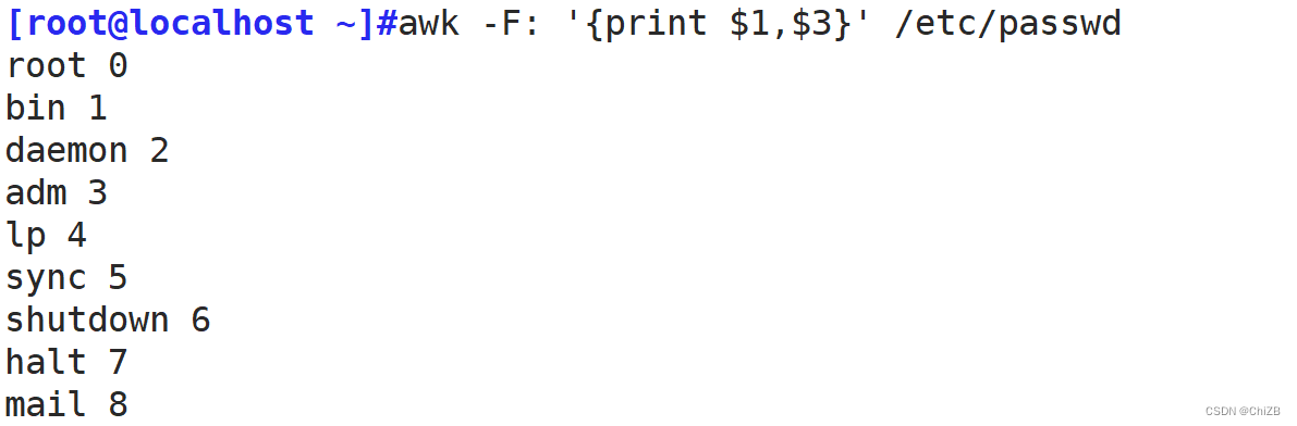 [root@localhost data]#awk -F: -f passwd.awk /etc/passwd