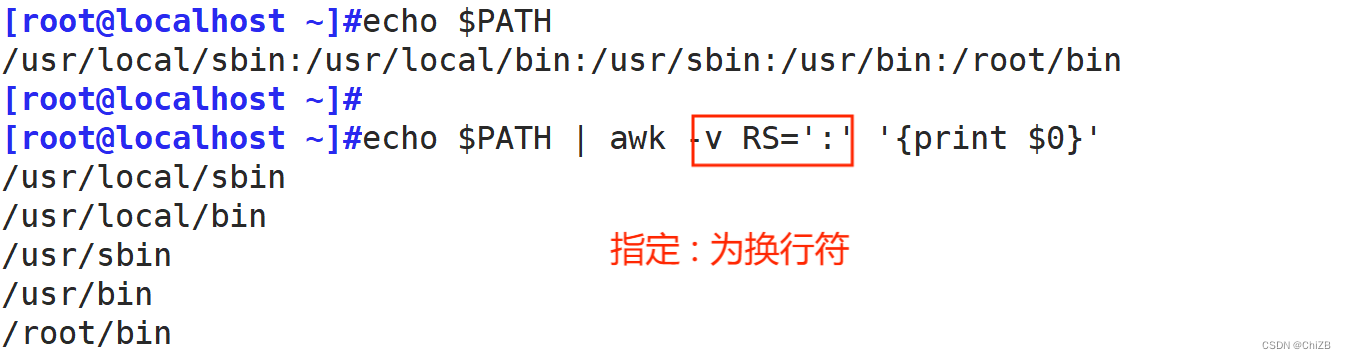 | RS | 行分隔符。awk从文件上读取资料时,将根据RS的定义就把资料切割成许多条记录,而awk一次仅读入一条记录进行处理。预设值是\n |