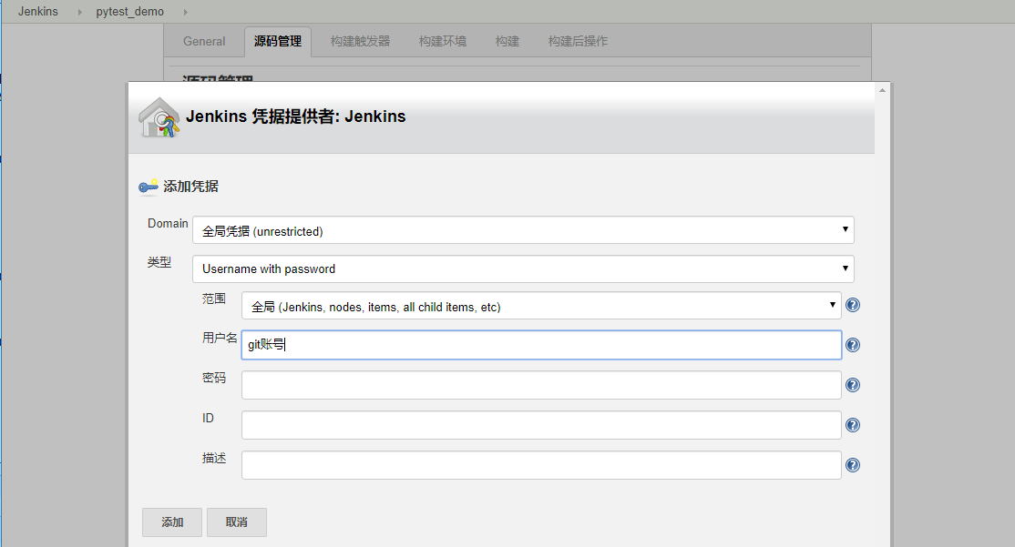 Credentials 点开Jenkins按钮,输入git仓库登陆的账号和密码