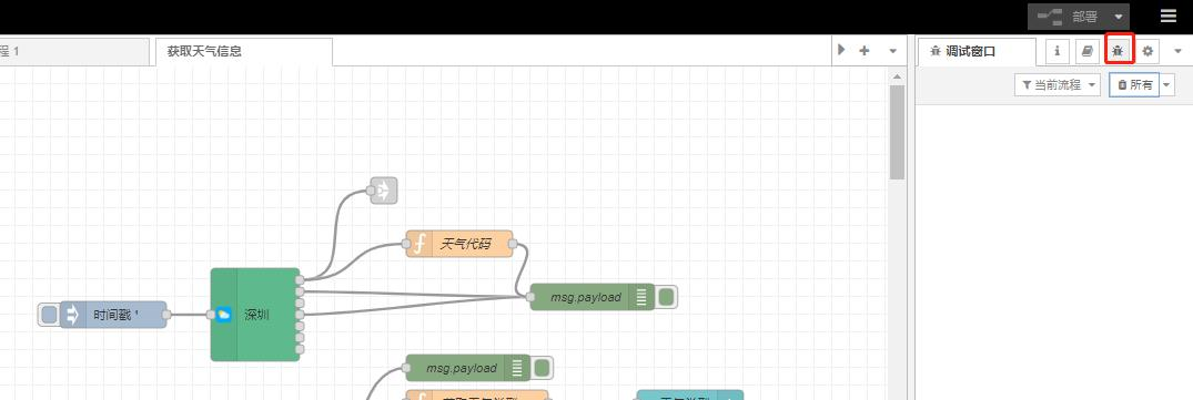 案例功能:使用node-red 工具与气象网站通信。基于node-red 部署程序,实现获取深圳天气信息。