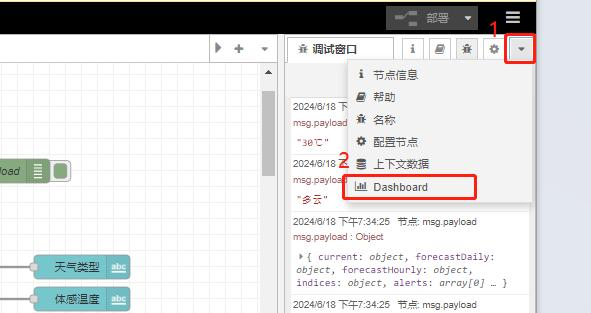 使用的依赖模块有:“ node-red-dashboard ”、“ noed-red-contrib-weather ”。请参考上方“安装依赖模块 ”步骤安装上相应依赖模块。