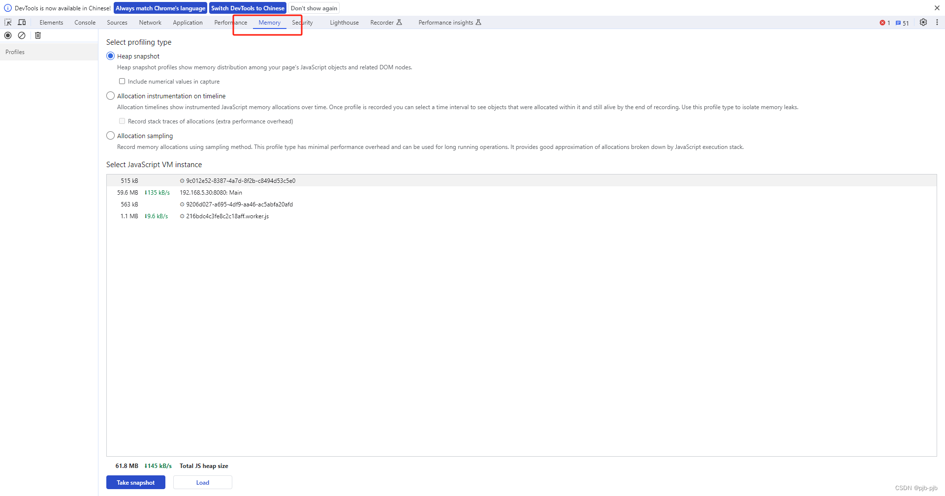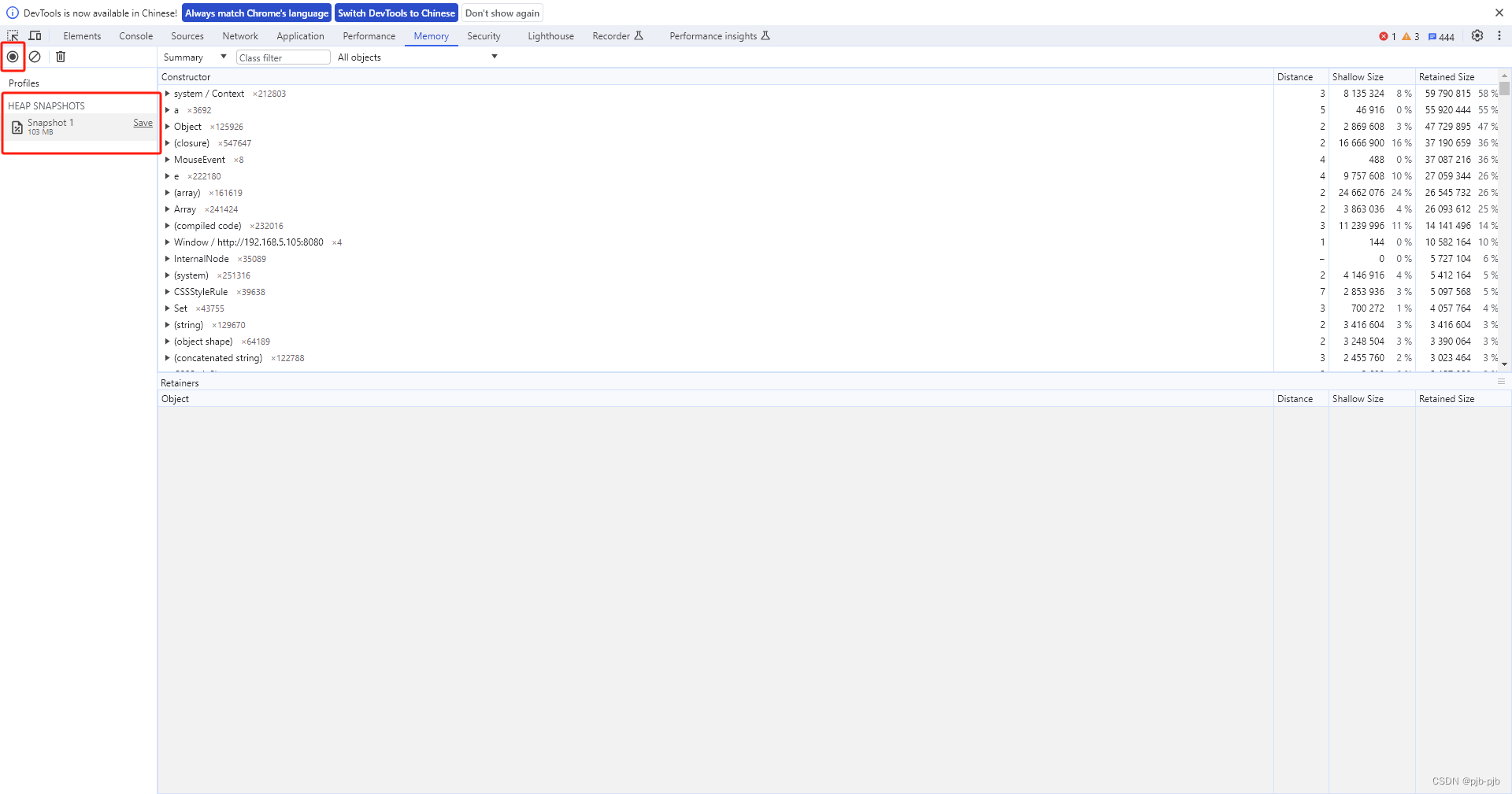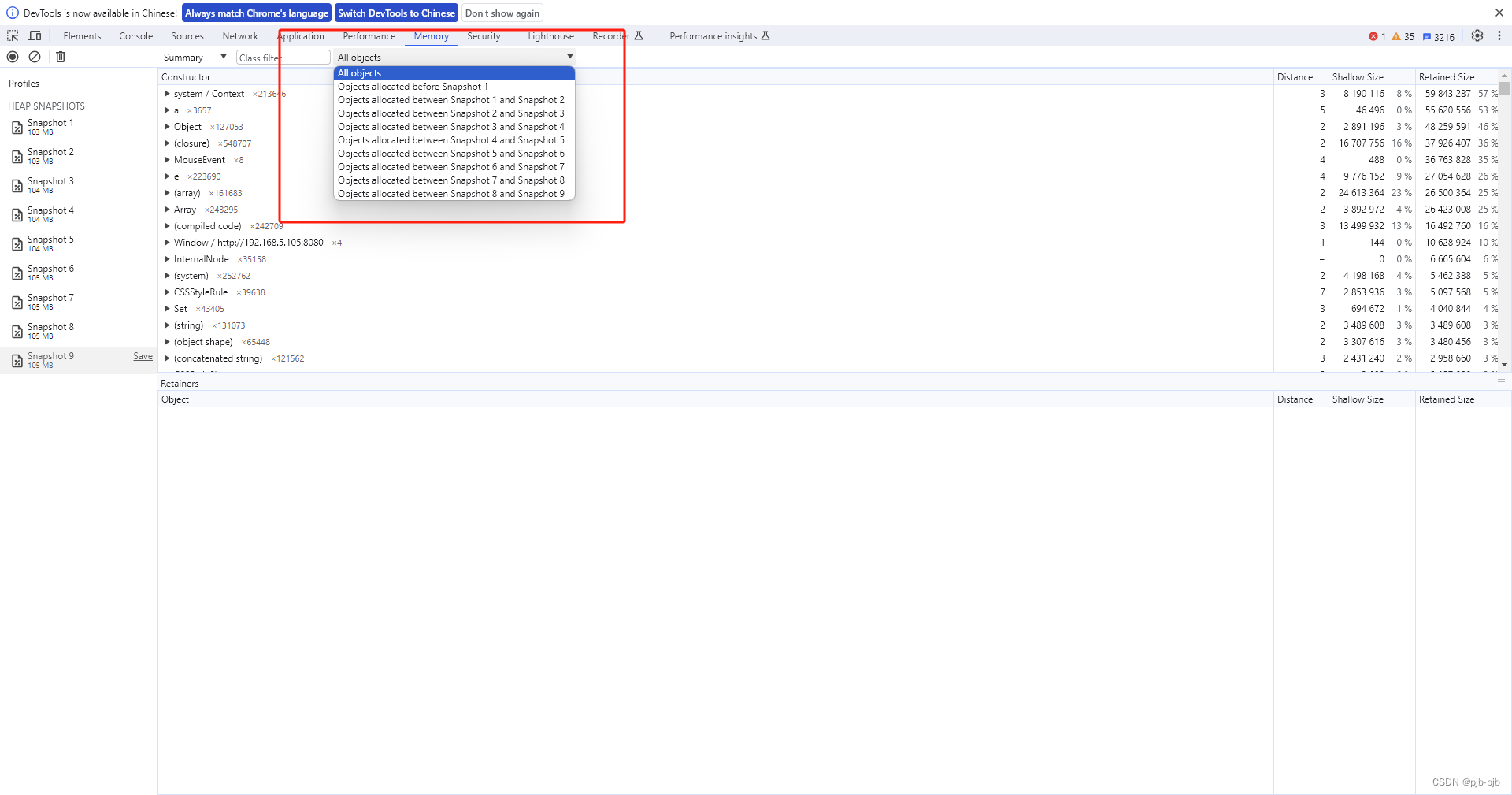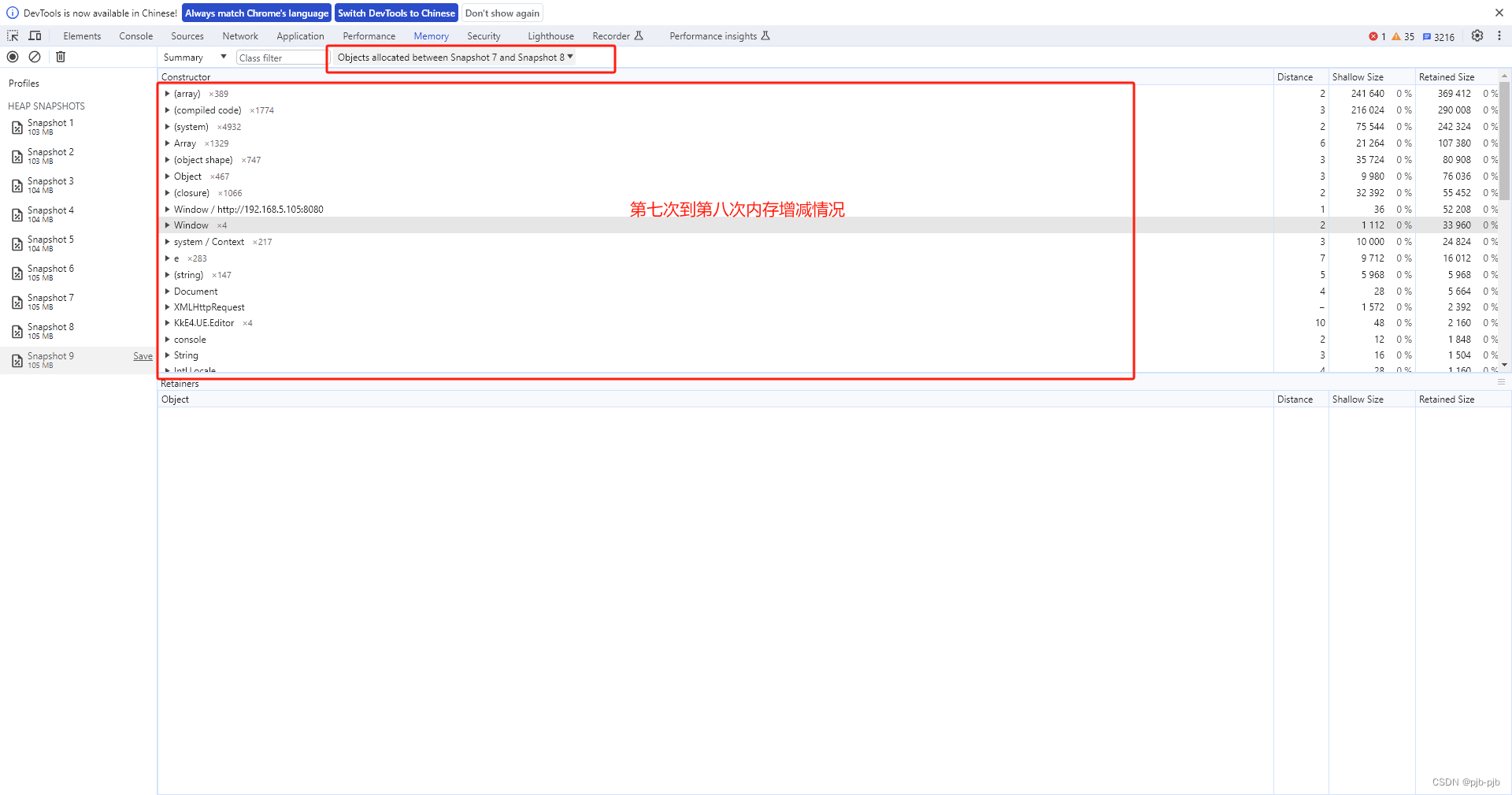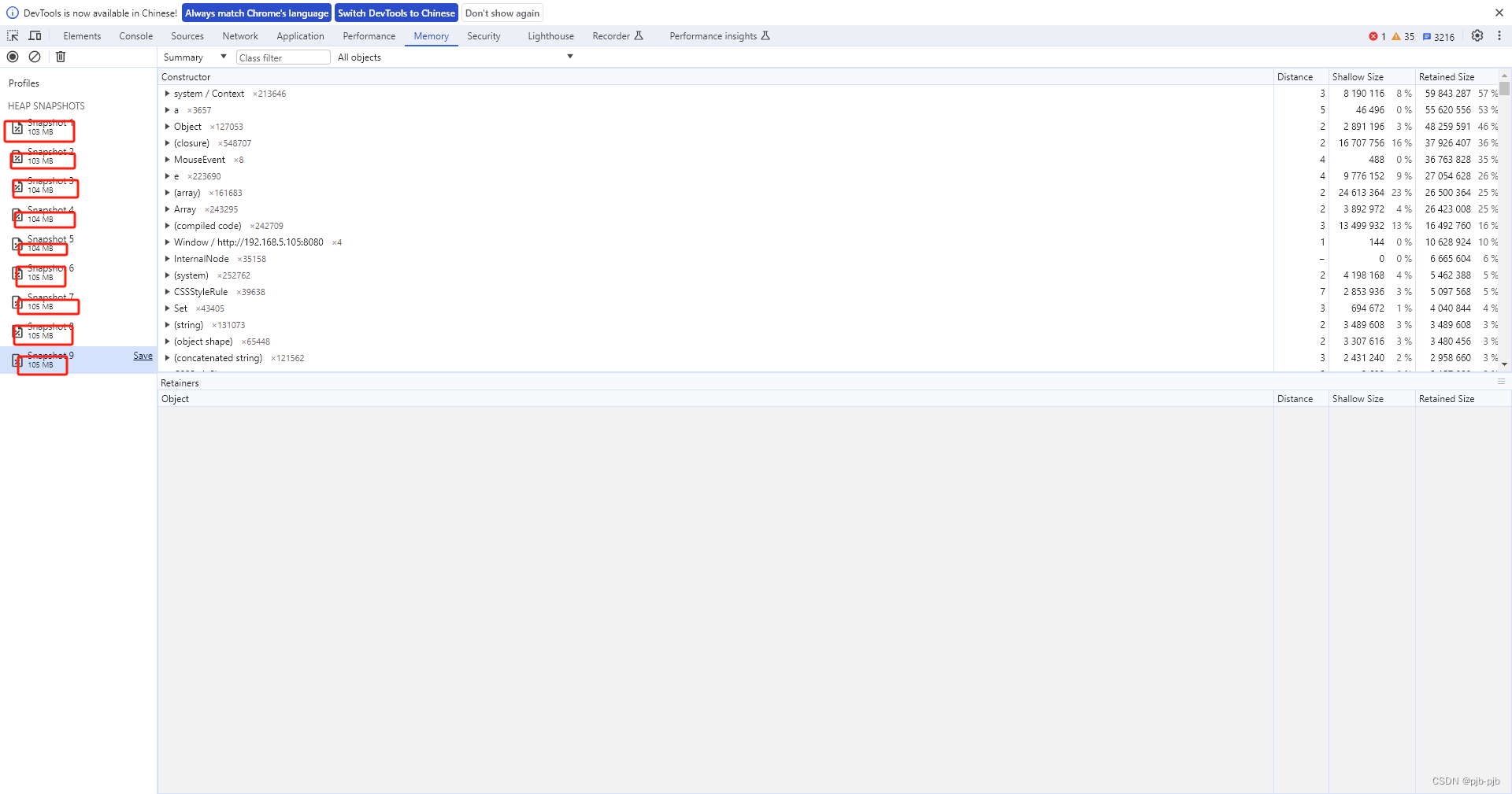 5)多次重复上述2、3、4步骤生成多次快照,对比每次快照生成的当前内存大小去比较,如果每次内存都会明显增加,说明存在内存泄漏问题