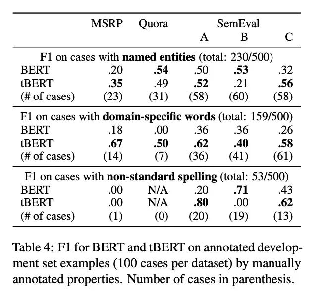 作者是这么做的实验,他选了和主题模型相关的三个属性:实体,特定领域词和不规范拼写。根据三个属性抽取样本,总共500个, 然后让BERT和tBERT做预测。