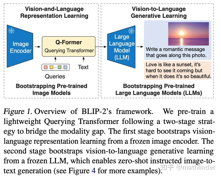 给定一个视觉模态的单模态模型,一个文本模态的大规模语言模型(LLM),训练两者之间的起桥梁作用的模块(Q-former)。训练captioning任务,训练的冻住视觉模型和语言模型,只训其中的Q-former。