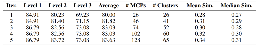 性能在迭代 3 次后趋于饱和,平均准确率从 80.00%(k=1)升至 83.03%(k=3),之后增长缓慢。