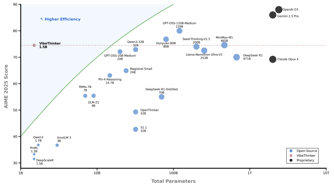 更令人印象深刻的是,相比基础模型(AIME25仅4.3分),VibeThinker实现了超过70分的提升,证明其训练方法的极端有效性。
