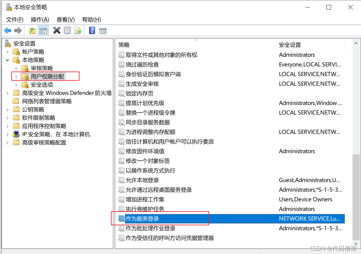 3、打开本地安全策略,本地策略-> 用户权限分配->作为服务登录,右键选择“属性”,在打开的页面中点击“添加用户或组”