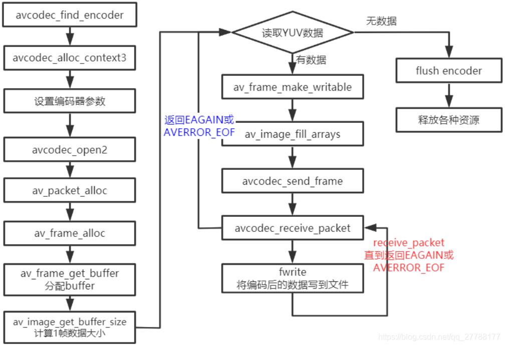- avcodec_receive_packet : 获取到编码后的 AVPacket 数据
