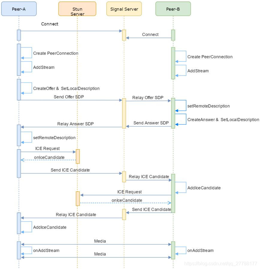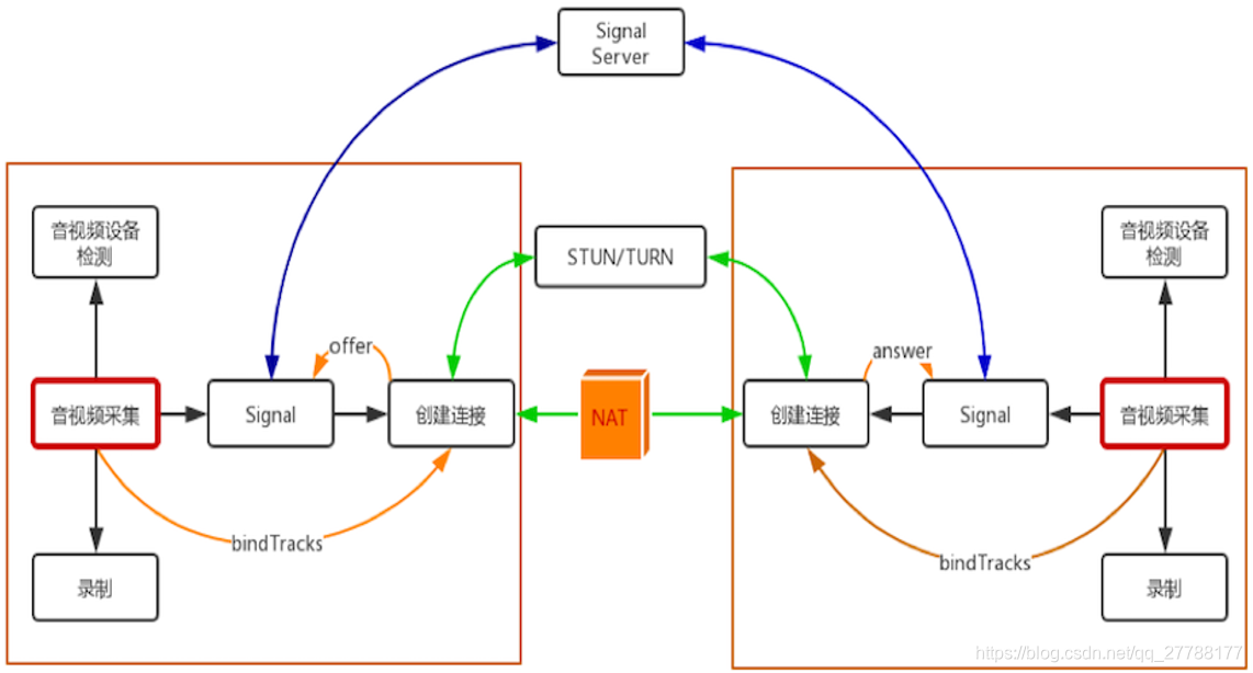 - 两个 WebRTC 终端,负责音视频采集、编解码、NAT 穿越、音视频数据传输;