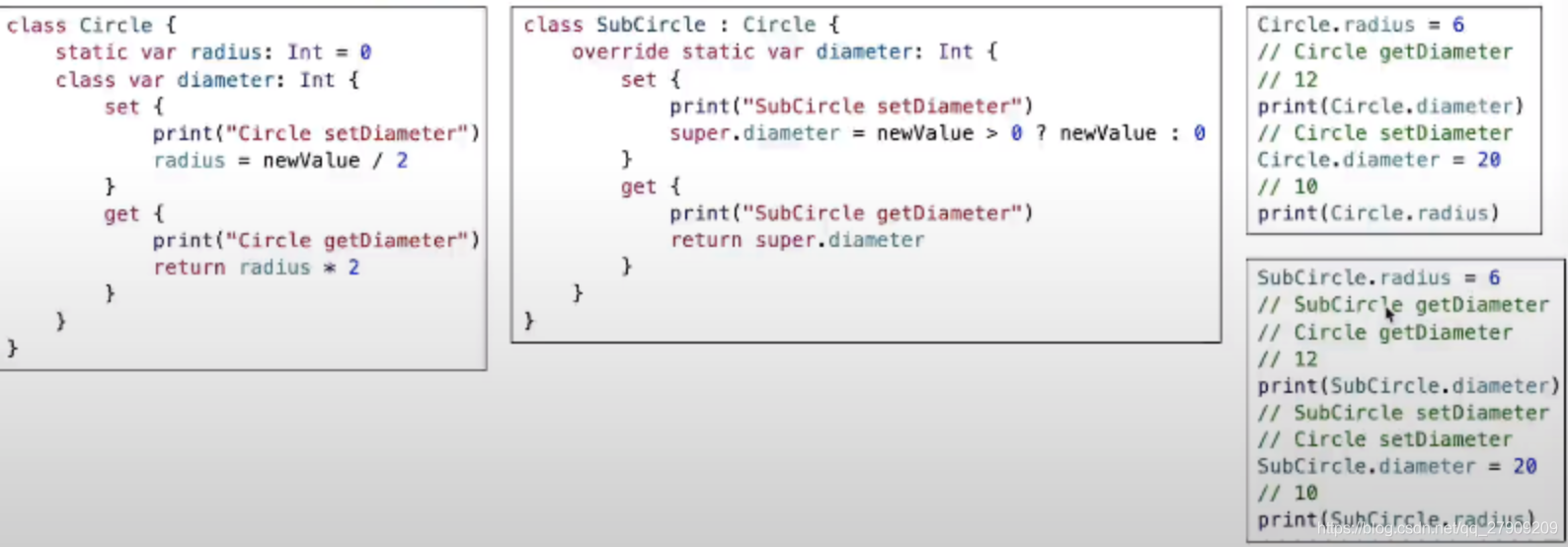 被class修饰的计算类型属性,可以被子类重写,被static修饰的类型属性(存储、计算),不可以被子类重写