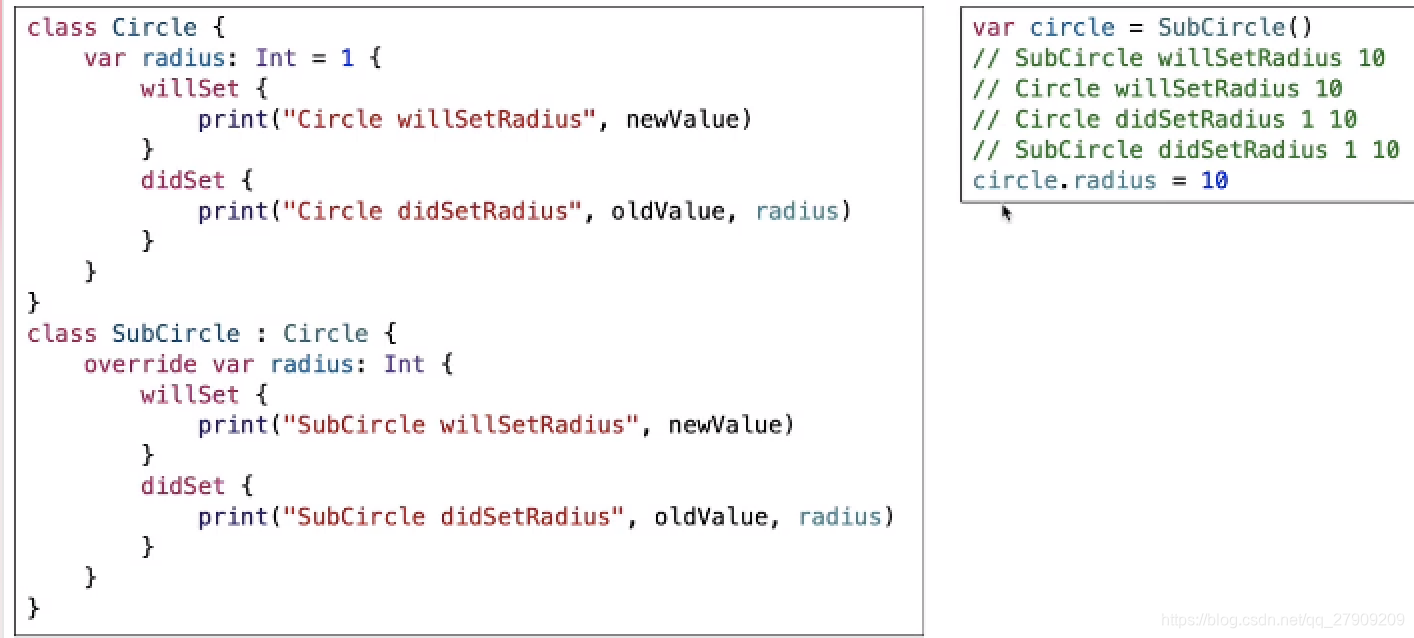 可以在子类中为父类属性(除了只读计算属性、let属性)增加属性观察器