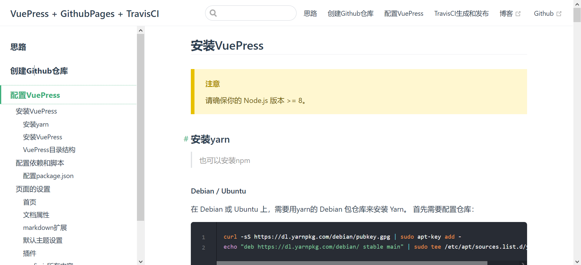 创建 VuePress + GithubPages + TravisCI 在线文档 [TOC]最新博客链接VuePress 在线文档链接_Github PagesVuePress 在线文档链接_博客服务器(如果上面进不去,可以进这个,服务器在阿里云)Github链接最终效果最终效果链接思路总体VuePress 在本地完成项目的源文件,推送至 Github 触发 Travis CI 自动构建目标文件,完成后自动部署到另一个 Github 分支,此...