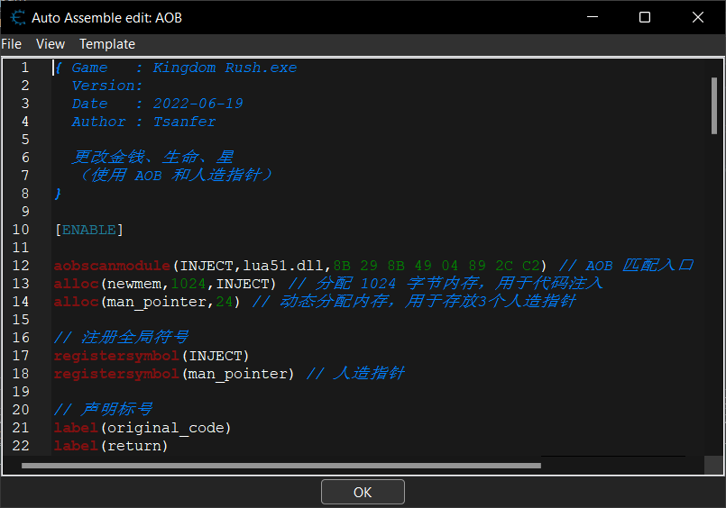 使用 Cheat Engine 修改 Kingdom Rush 中的金钱、生命、星 代码注入:在程序运行时,将自己写的代码,替换掉原有的代码AOB:(Array Of Byte)在内存中搜索特定的一串数据,以决定注入代码的位置人造指针:单独找个地方,记录变量所在的地址