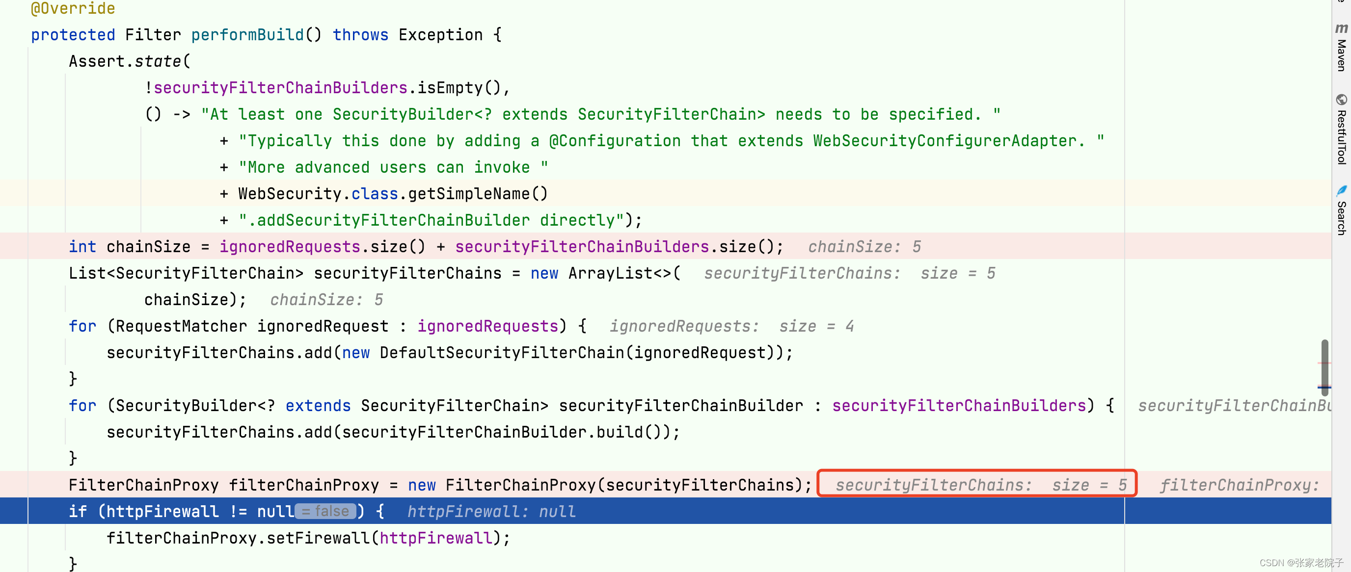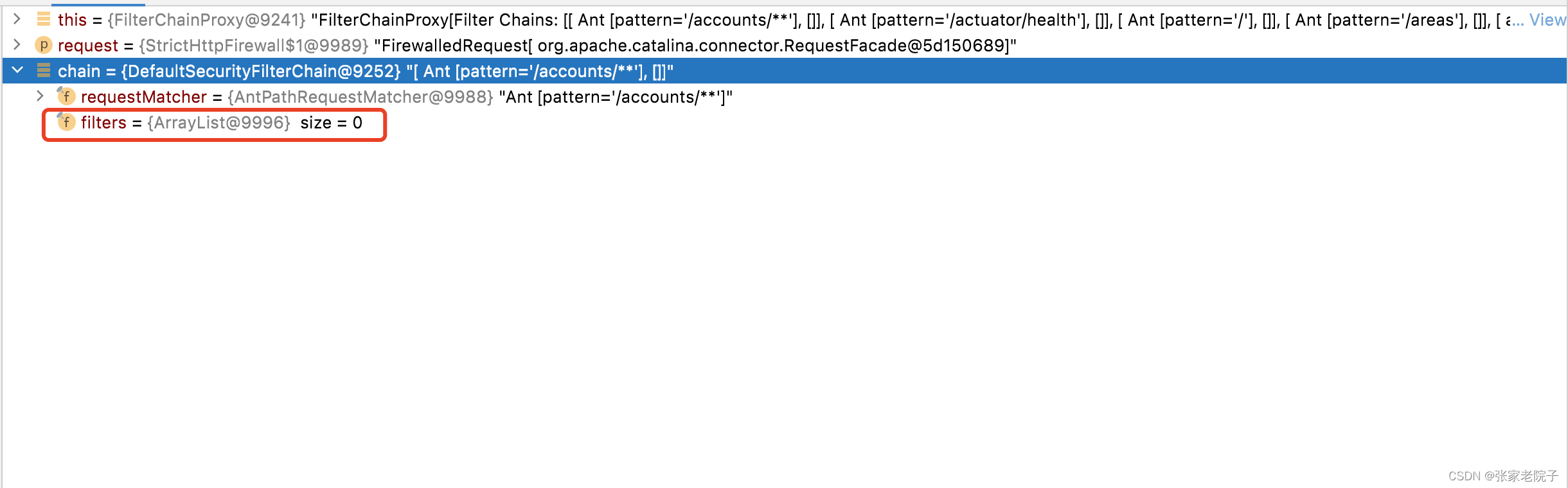 debug时可以看到生成了五个过滤器的chain,包含四个ignoring()的chain。