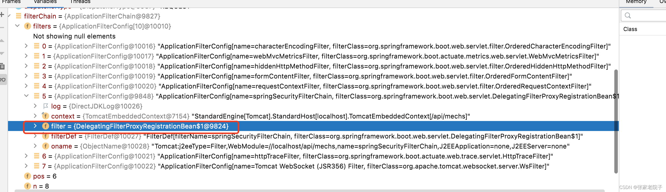 如下图是Tomcat获取的所有过滤器链。FilterBean会被加载到servler上下文,和security 的FilterChainProxy同一等级。