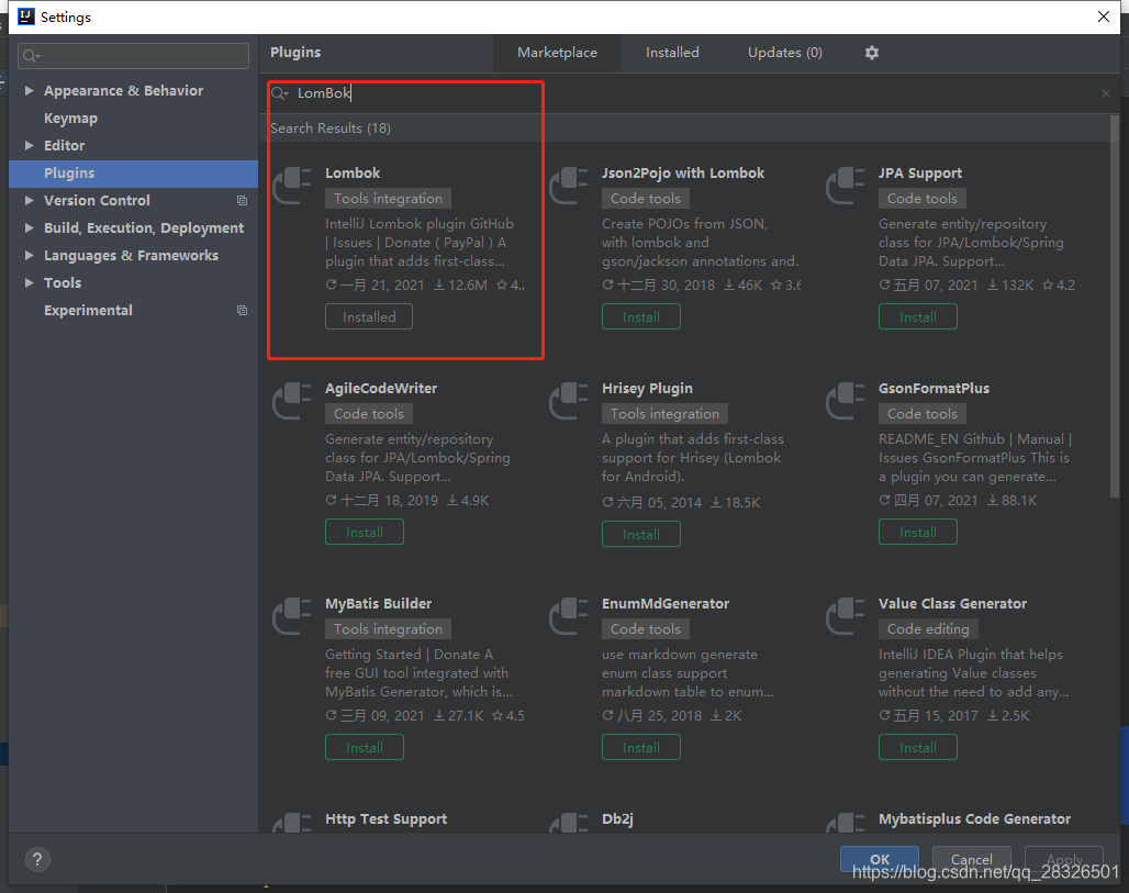 1、进去 File --- Settings... --- Pligins : 搜索LomBok 点击install进行安装重启