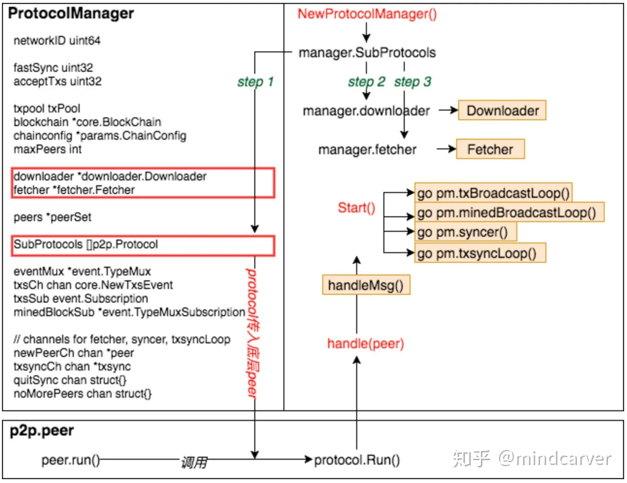 ProtocolManager,从字面上看是协议管理器,负责着p2p通信协议的管理。它连接了p2p的逻辑层peer与顶层peer之间的调用,从顶层将协议传递至逻辑层,再从逻辑层得到message传递到顶层。