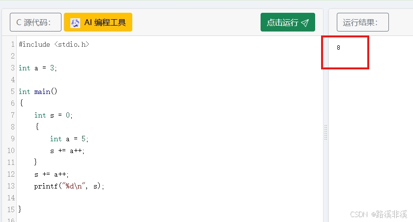 int a = 3; int main() { int s = 0; { int a = 5; s += a++; } s += a++; printf("%d\n", s); }结果如下所示: