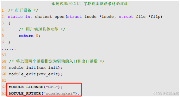 module_init(xxx_init);//注册模块加载函数 module_exit(xxx_exit);//注册模块卸载函数module_init 函数用来向 Linux 内核注册一个模块加载函数,参数 xxx_init 就是需要注册的具体函数,当使用“insmod”命令加载驱动的时候,xxx_init 这个函数就会被调用。module_exit()函数用来向 Linux 内核注册一个模块卸载函数,参数 xxx_exit 就是需要注册的具体函数,当使用“rmmod”命令卸载具体驱动的时候 xxx_exit 函数就会被调用。字符设备驱动模块加载和卸载模板如下所示: