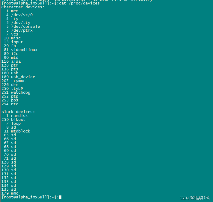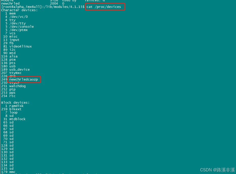 在图 40.2.2.1 中可以列出当前系统中所有的字符设备和块设备,其中第 1 列就是设备对应的主设备号。200 这个主设备号在我的开发板中并没有被使用,所以我这里就用了 200 这个主设备号。第 21 行,调用函数 unregister_chrdev 注销主设备号为 200 的这个设备。