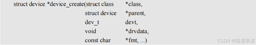 device_create 是个可变参数函数,参数 class 就是设备要创建哪个类下面;参数 parent 是父设备,一般为 NULL,也就是没有父设备;参数 devt 是设备号;参数 drvdata 是设备可能会使用的一些数据,一般为 NULL;参数 fmt 是设备名字,如果设置 fmt=xxx 的话,就会生成/dev/xxx这个设备文件。返回值就是创建好的设备。