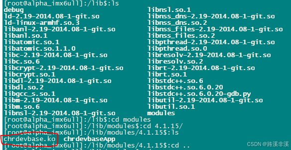 insmod drv.koinsmod 命令不能解决模块的依赖关系,比如 drv.ko 依赖 first.ko 这个模块,就必须先使用insmod 命令加载 first.ko 这个模块,然后再加载 drv.ko 这个模块。但是 modprobe 就不会存在这个问题,modprobe 会分析模块的依赖关系,然后会将所有的依赖模块都加载到内核中,因此modprobe 命令相比 insmod 要智能一些。modprobe 命令主要智能在提供了模块的依赖性分析、错误检查、错误报告等功能,推荐使用 modprobe 命令来加载驱动。modprobe 命令默认会去/lib/modules/<kernel-version>目录中查找模块,比如本书使用的 Linux kernel 的版本号为 4.1.15,因此 modprobe 命令默认会到/lib/modules/4.1.15 这个目录中查找相应的驱动模块,一般自己制作的根文件系统中是不会有这个目录的,所以需要自己手动创建。