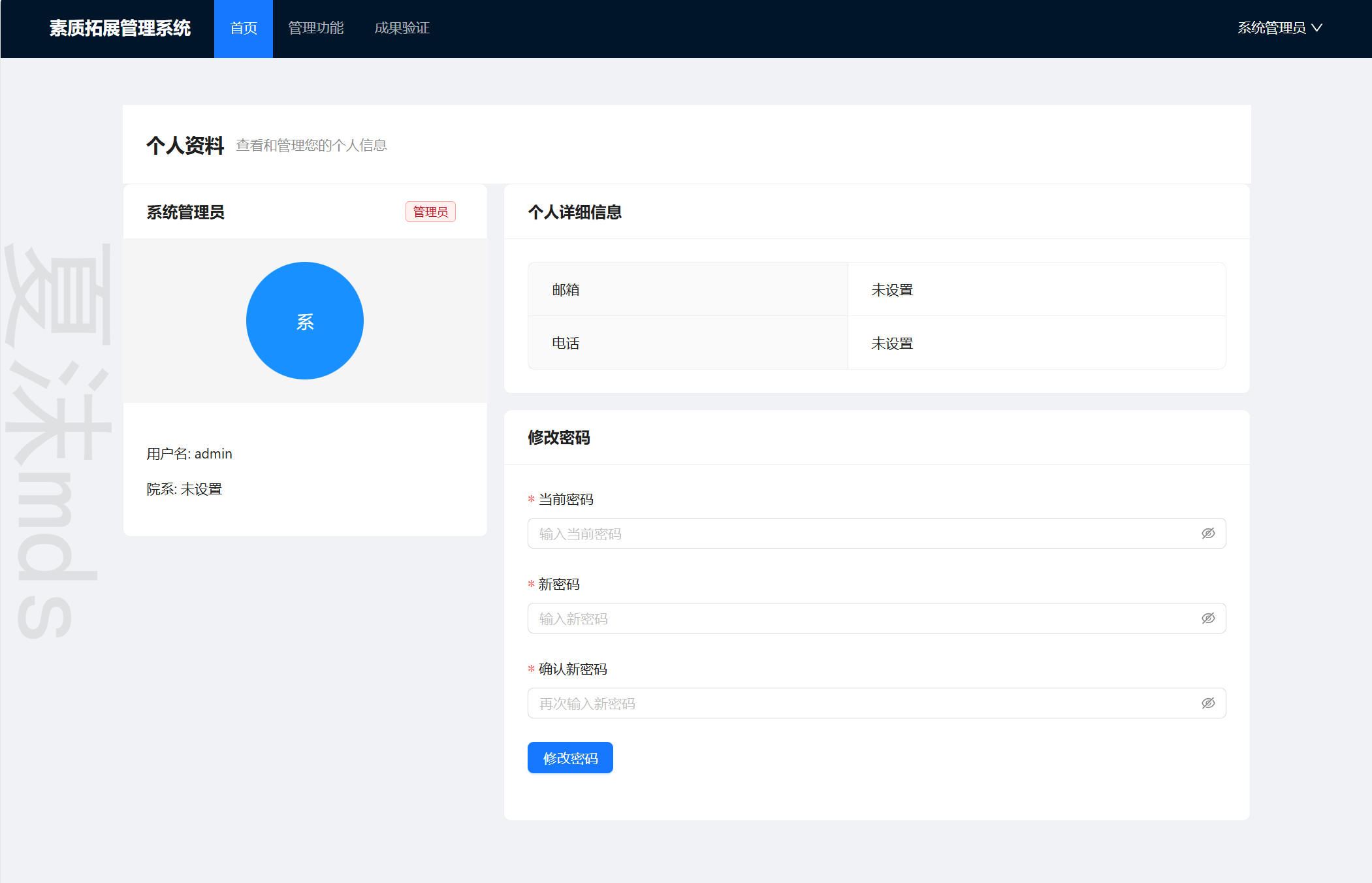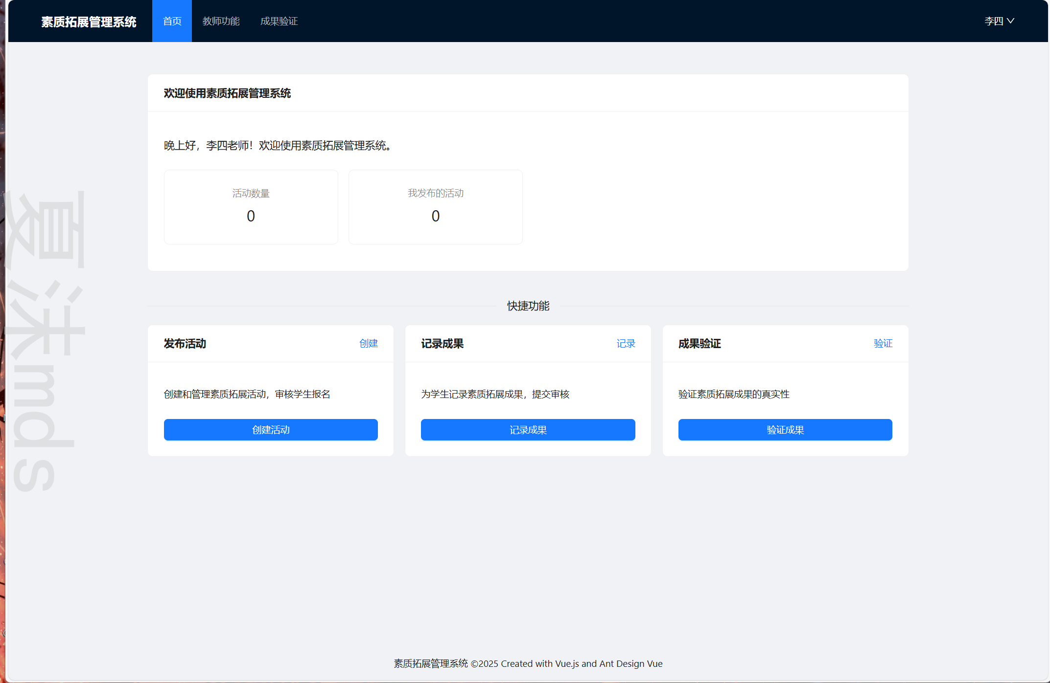 本系统是一个基于区块链技术的高校素质拓展活动管理平台,为师生提供便捷、透明的素质拓展活动管理及学分认证服务。系统利用Hyperledger Fabric区块链确保成果数据的不可篡改性和可追溯性。