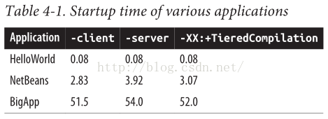 可以看到,对于中等大小的GUI应用,使用client编译器,启动时间最短,有将近38.5%的提升。对于大型应用,使用各种编译器的启动时间差别不大。