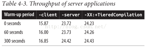 1)由于测试周期是60秒,所以,即使warm-up period是0s,server编译器也有足够的时间来发现热点代码并进行编译,所以,server编译器总是比client编译器的吞吐量要高。