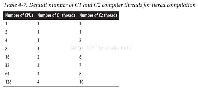 - 如果JVM使用的client编译器,那么,编译线程数目为1; 如果使用的是server编译器,那么,编译线程数目为2; 如果使用的是tiered compilation,那么线程数目和CPU数目相关,具体见下表(和CPU数目具有对数关系):