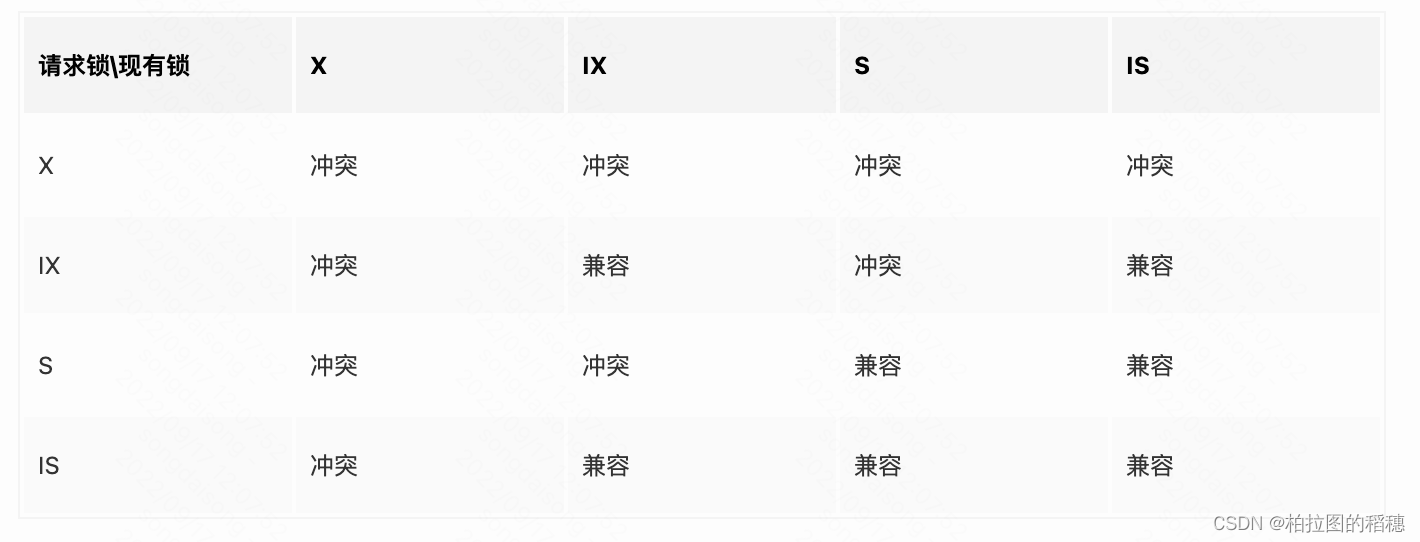 再比如,事务1在表1上加了S锁后,事务2想要更改某行记录,需要添加IX锁,由于不兼容,所以需要等待S锁释放;如果事务1在表1上加了IS锁,事务2添加的IX锁与IS锁兼容,就可以操作,这就实现了更细粒度的加锁。