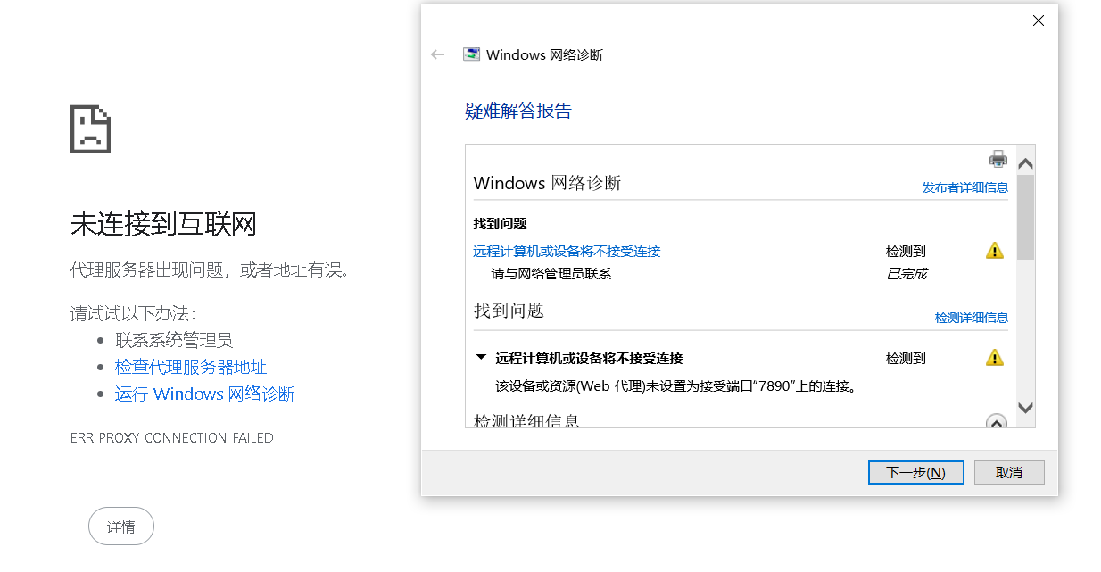 原因A.远程计算机或设备将不接受连接(该设备或资源(Web 代理)未设置为接受端口“7890”上的连接