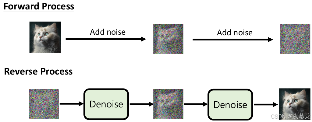 - 正向过程:每次往里加点噪声(就是一点点“雪花”),加很多次,最后变成完全的雪花噪声图