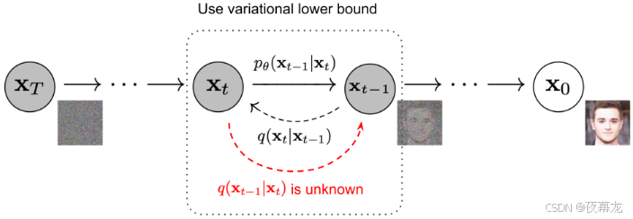 但是,我们无法估计 ,因为它需要使用整个数据集。我们的目标是学习一个模型,去近似这些条件概率,从而可以基于噪声来生成新样本