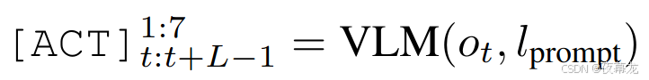 标准 PaliGemma 输入:一串图片 token + 一个语言 prompt token。π0增加了机器人本体状态 qt 输入,用线性映射投影到 transformer embedding 维度