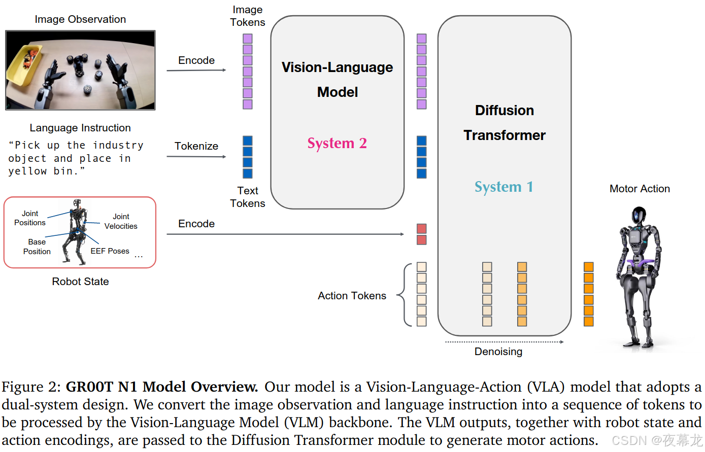 模型架构:采用扩散 Transformer 模块(System 1)结合 SigLIP-2 视觉嵌入,以流匹配目标训练
