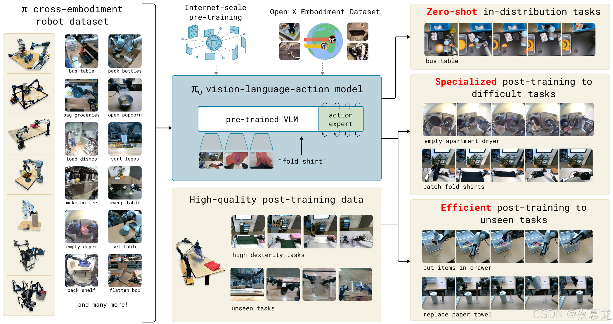 π0 提出一种新的流匹配(flow matching)架构,搭建在预训练视觉-语言模型(VLM)之上,能够继承互联网上的大规模语义知识